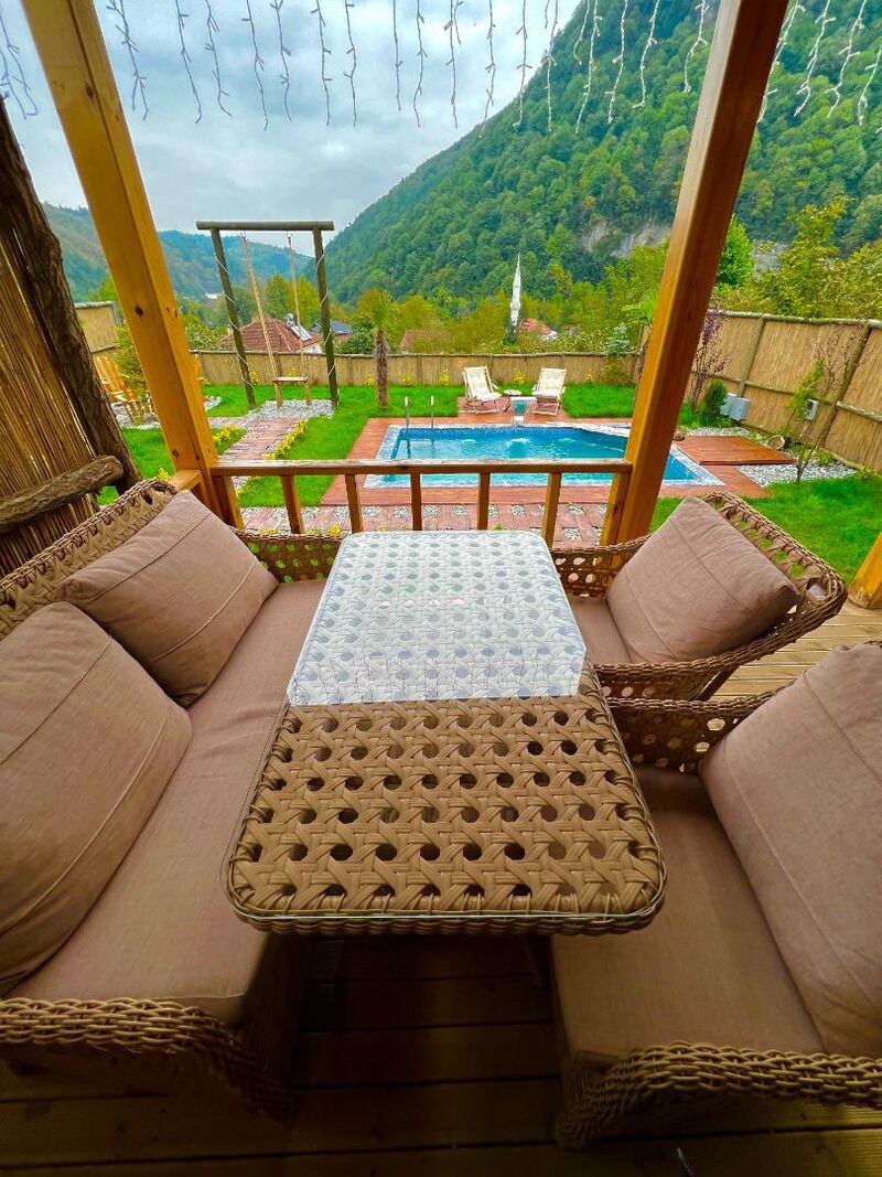 Bahçe alanlarında özel yüzme havuzları, şezlonglar ve bahçe mobilyalarıyla çevrili bungalovlarımız, size doğayla iç içe, özel bir konaklama deneyimi sunuyor. Barbekü alanları ve ateş çukurları, sevdiklerinizle keyifli vakit geçirmeniz için ideal ortamı oluşturuyor.